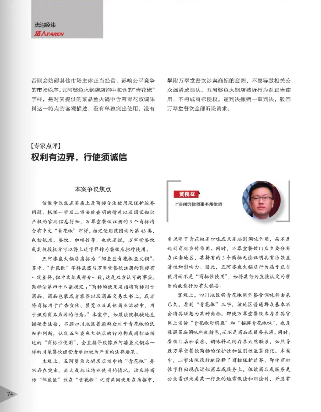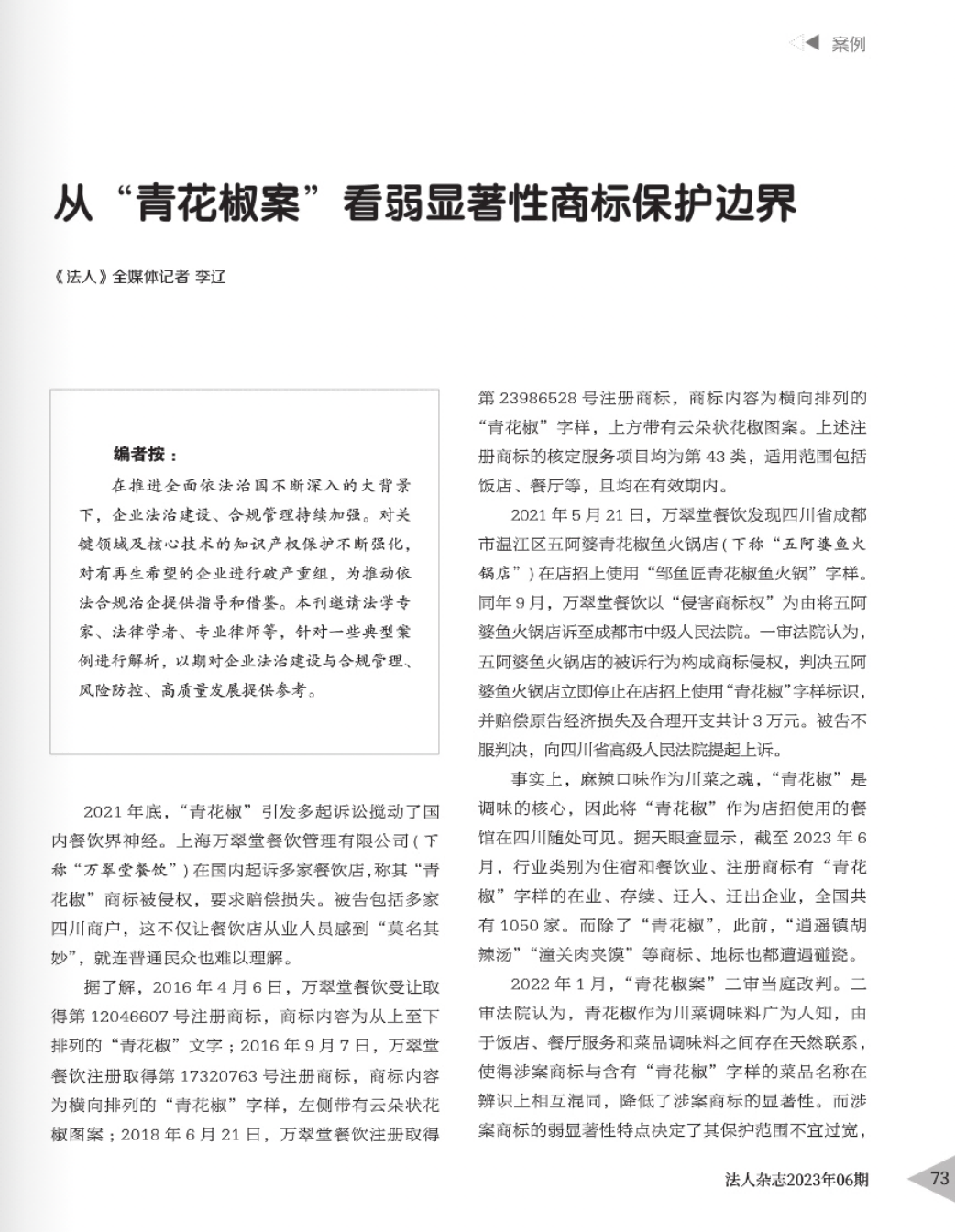 合肥辉知简讯 | 辉知队黄俊益律师应“法治日报”旗下杂志邀请,就“青花椒”案发表专家点评